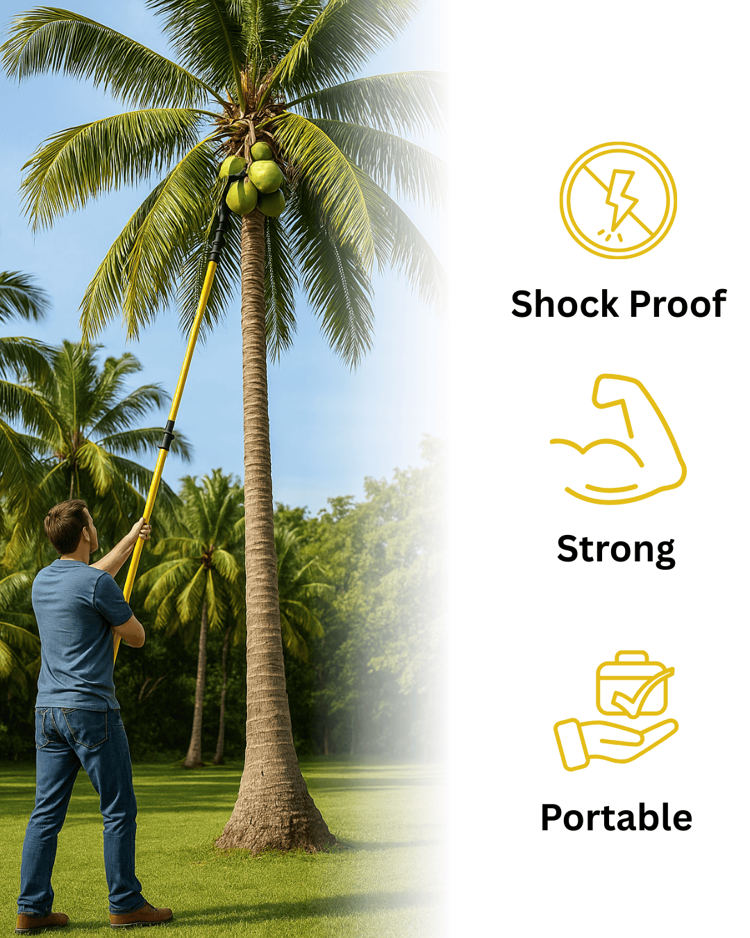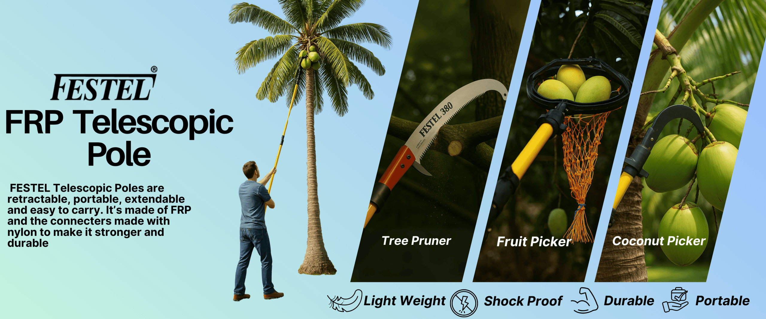 Reach higher. Work safer. Our FRP Telescopic Pole is lightweight, non-conductive, and built to last, comes with 3 attachments : Tree Pruner, Coconut Picker & Fruit Picker.